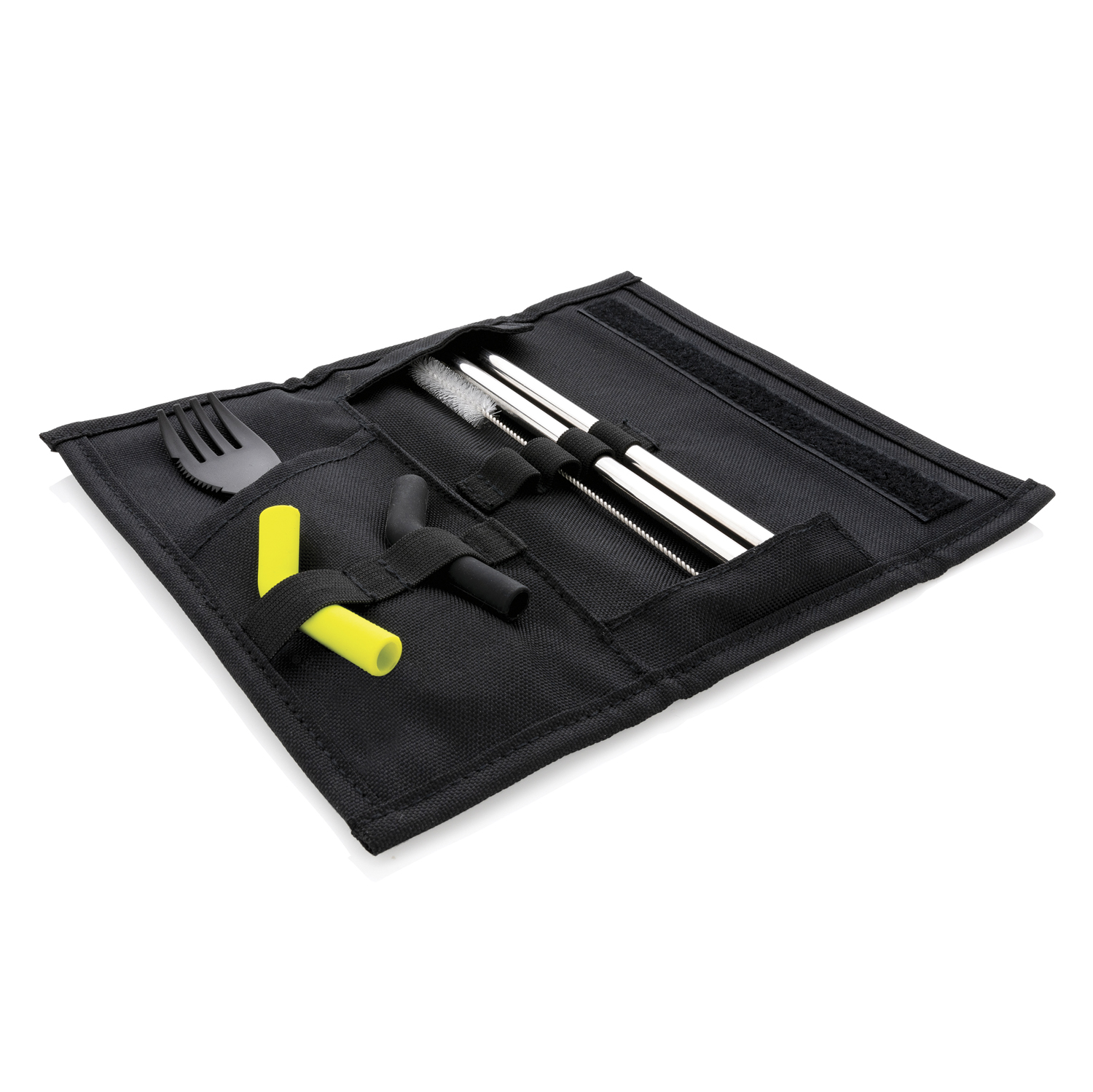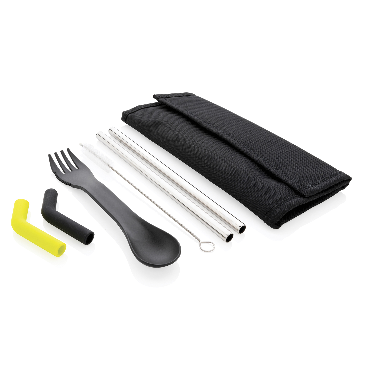 Набор столовых приборов Tierra — идеальный спутник для тех, кто хочет сократить использование одноразового пластика. В него входят 2 соломинки из нержавеющей стали, ершик для мытья, ложка-вилка и 2 силиконовые насадки на трубочки для более комфортного питья. Благодаря разным цветам насадок вы легко отличите их друг от друга. Приборы поставляются в удобном чехле для хранения, который надежно закрывается на липучку. Совместим с посудомоечной машиной. Чехол снаружи — полиэстер 600D, внутри — 100% полиэстер 210D. Не содержит ПВХ.