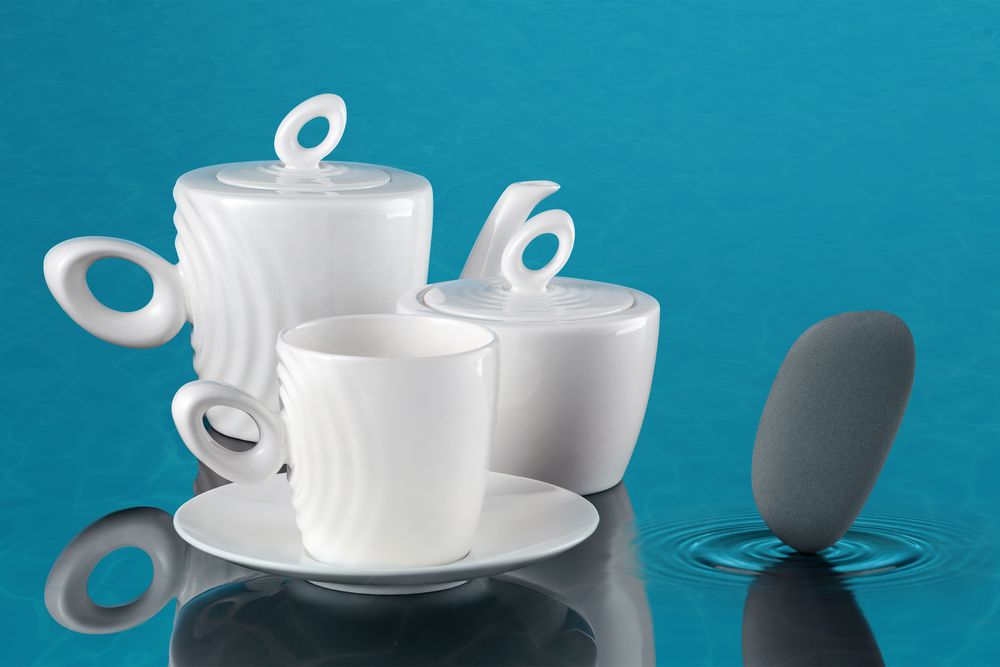Крышка сахарницы создана в скульптурной технике: фарфор словно запечатлел сам момент движения. Необычная ручка предметов символизирует камень, от которого появляются завораживающие круги на воде.