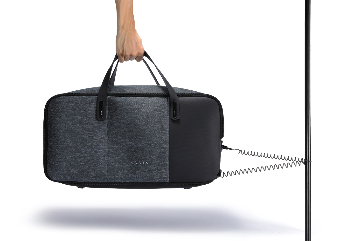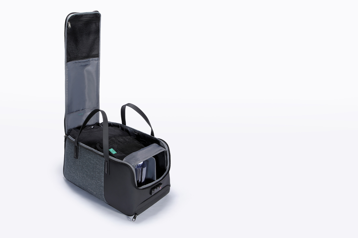 • USB-кабель из внутреннего кармана на молнии 13х18 см соединен с портом на внешней стороне сумки.