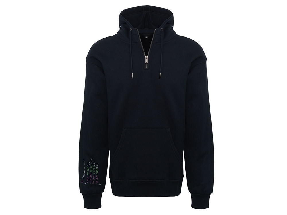 Худи с капюшоном ворот на молнии. Шнур в капюшоне с металлическими наконечниками. Отделка горловины спинки внутри тесьмой, Риб 2х2 по низу изделия и манжетам. Удобный карман кенгуру.