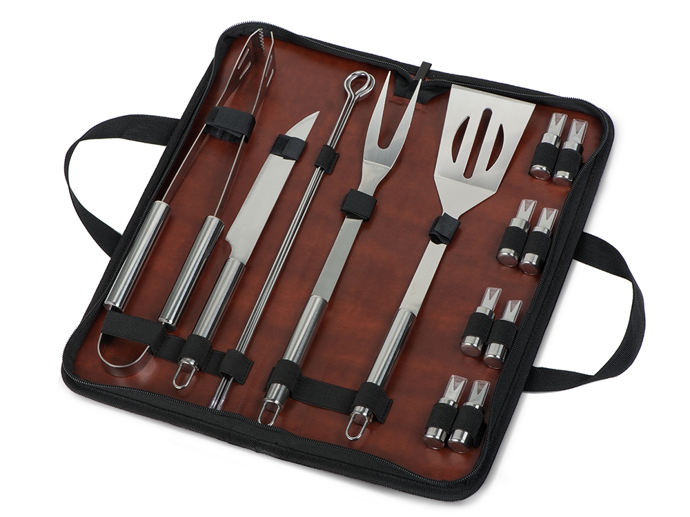 Набор для барбекю Fabrizio состоит из ножа, лопатки, вилки, щипцов, четырех шампуров и восьми вилок для кукурузы, упакованный в чехол-книжку с ручками для переноски.