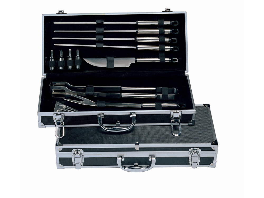 Набор для барбекю 12 предметов. 4 шампура, 4 шпажки для снятия шашлыка, нож, щипцы, вилка, лопатка. Шильд в комплекте 4,8 х 8,3 см. Гравировка (оптоволоконный лазер) (Без чернения) на данный товар осуществляется бесплатно. Оплачивается только настройка оборудования в размере 2700 рублей на весь тираж.