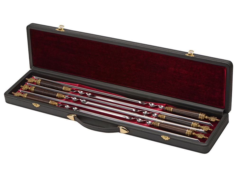 Шампура из нержавеющей стали с ручками из дерева венге и литьем в виде герба РФ. Дипломат из натуральной кожи с бархатной отделкой.