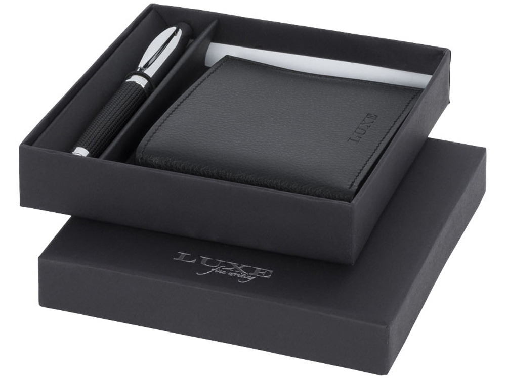 Подарочный набор из шариковой ручки и кошелька. Два необходимых предмета в одном стильном подарочном наборе. Шариковая ручка с кожаным покрытием с бумажником. Эксклюзивный дизайн. Предлагается в подарочной коробке LUXE. Металл и искусственная кожа. Тиснение (Блинт) на данный товар осуществляется бесплатно. Оплачивается только настройка оборудования в размере 8700 рублей на весь тираж.