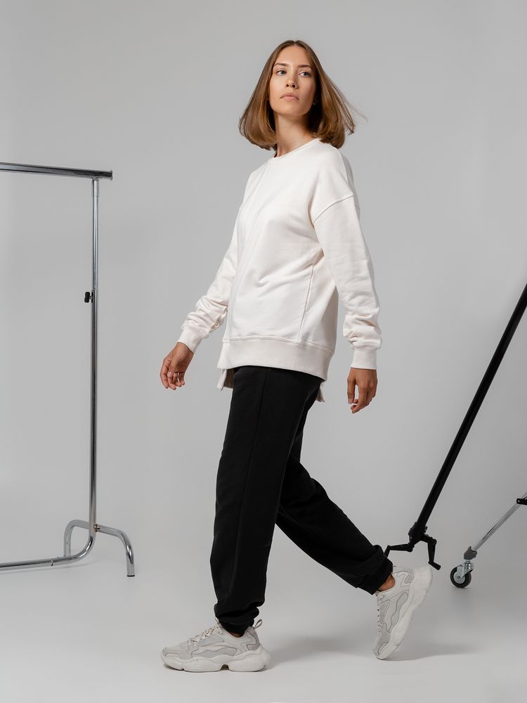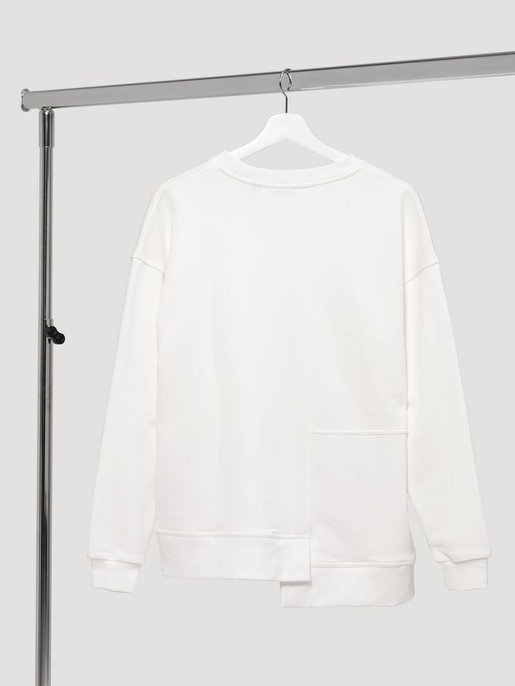 Свитшот унисекс свободного кроя со спущенным плечом и нестандартным нижним краем.