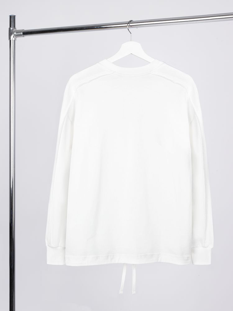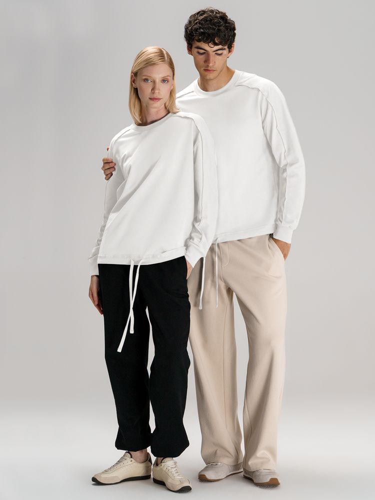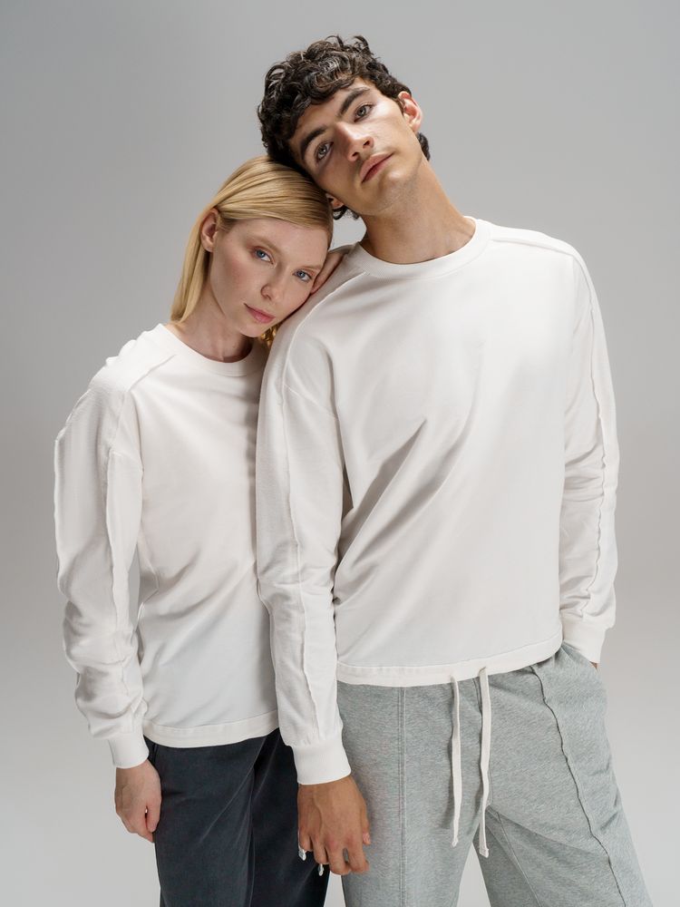 Свитшот унисекс оригинального пошива вдохнет новую жизнь в повседневный гардероб и добавит стильную нотку легкой небрежности в образ. Особая конструкция, где часть деталей — плечи и рукава — вывернута наизнанку, создает необычный притягательный эффект.