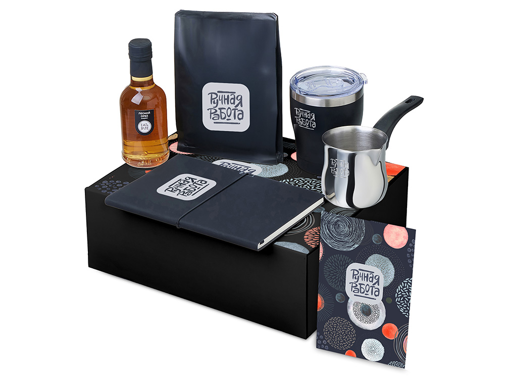 сироп - стекло, блокнот - искусственная кожа, бумага, турка - нержавеющая сталь, бакелит, кофе - пластик, термокружка - нержавеющая сталь, керамика, полипропилен, мешок - нетканый материал (спанбонд), коробка -картон