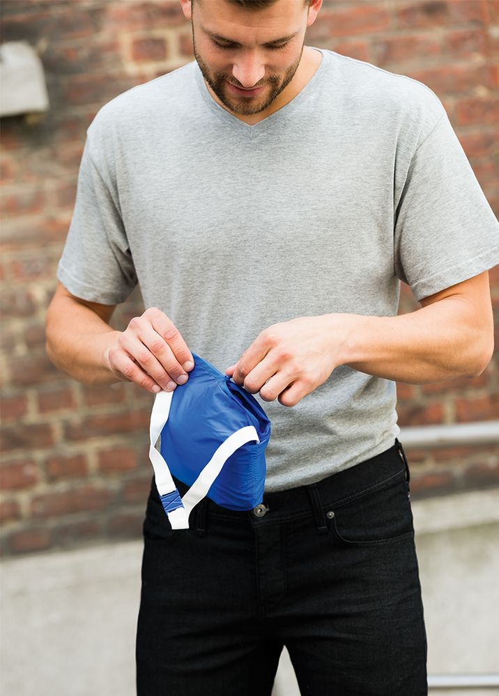 - Карман куртки служит сумочкой для нее: при необходимости ветровку можно компактно сложить, застегнуть карман на молнию и использовать пришитую эластичную тесьму, чтобы носить сложенную ветровку с собой на поясе.
