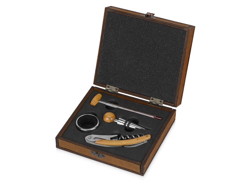 В набор аксессуаров для вина входят штопор-открывалка, воротничок на бутылку, пробка для бутылки и даже термометр. Набор поставляется в презентабельном деревянном футляре. Гравировка (оптоволоконный лазер) (Без чернения) на данный товар осуществляется бесплатно. Оплачивается только настройка оборудования в размере 2700 рублей на весь тираж.