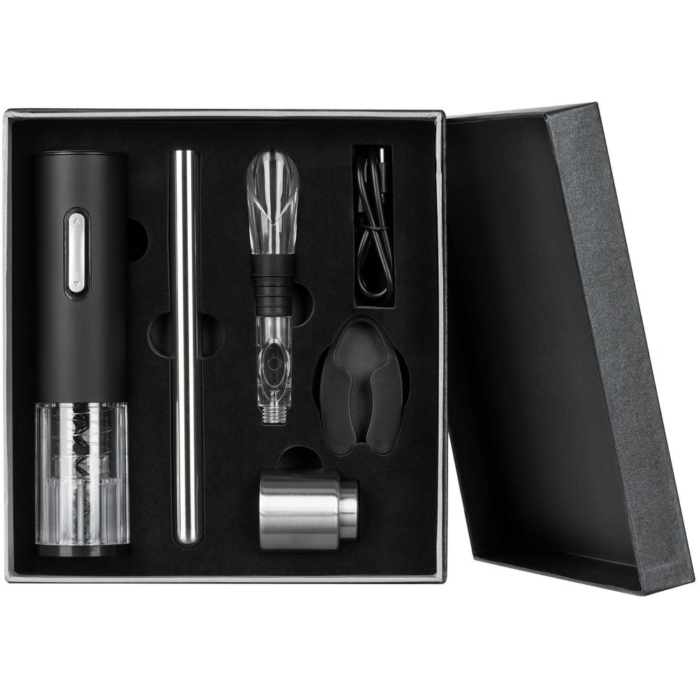 Набор Wine Diesel — настоящая находка для ценителей вин. Благодаря продуманному дизайну использование автоматического штопора практически не требует участия человека. Изящный чиллер поддерживает температуру напитка до часа, удобная разливочная воронка дополнительно аэрирует вино и не позволяет пролить его мимо бокала, а небольшая вакуумная пробка сохраняет вкусовые свойства напитка в течение нескольких дней.