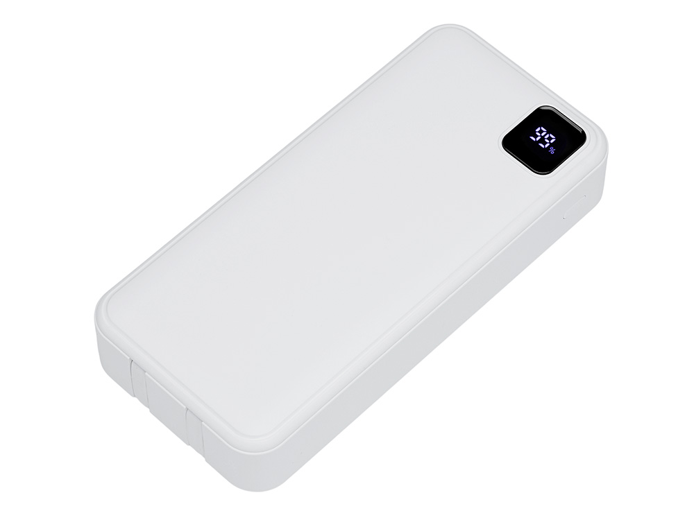Удобный внешний аккумулятор с функцией быстрой зарядки и встроенными кабелями USB-C (симметричный разъём USB тип С) и Lightning (разъём в ранних версиях iPhone) — ваш надежный партнер в путешествиях, на встречах и в повседневных задачах. Цифровой дисплей в реальном времени показывает точный остаток заряда и статус быстрой зарядки, а встроенные кабели и несколько разъемов позволяют заряжать до 4 устройств. Прочный корпус из переработанного АБС-пластика и емкость 20000 мАч обеспечивают зарядом все ваши устройства на долгий срок. Идеальный выбор для тех, кто ценит комфорт и функциональность в одном устройстве. Продуманная упаковка: для открытия просто потяните за язычок, и появится гаджет с нанесением.